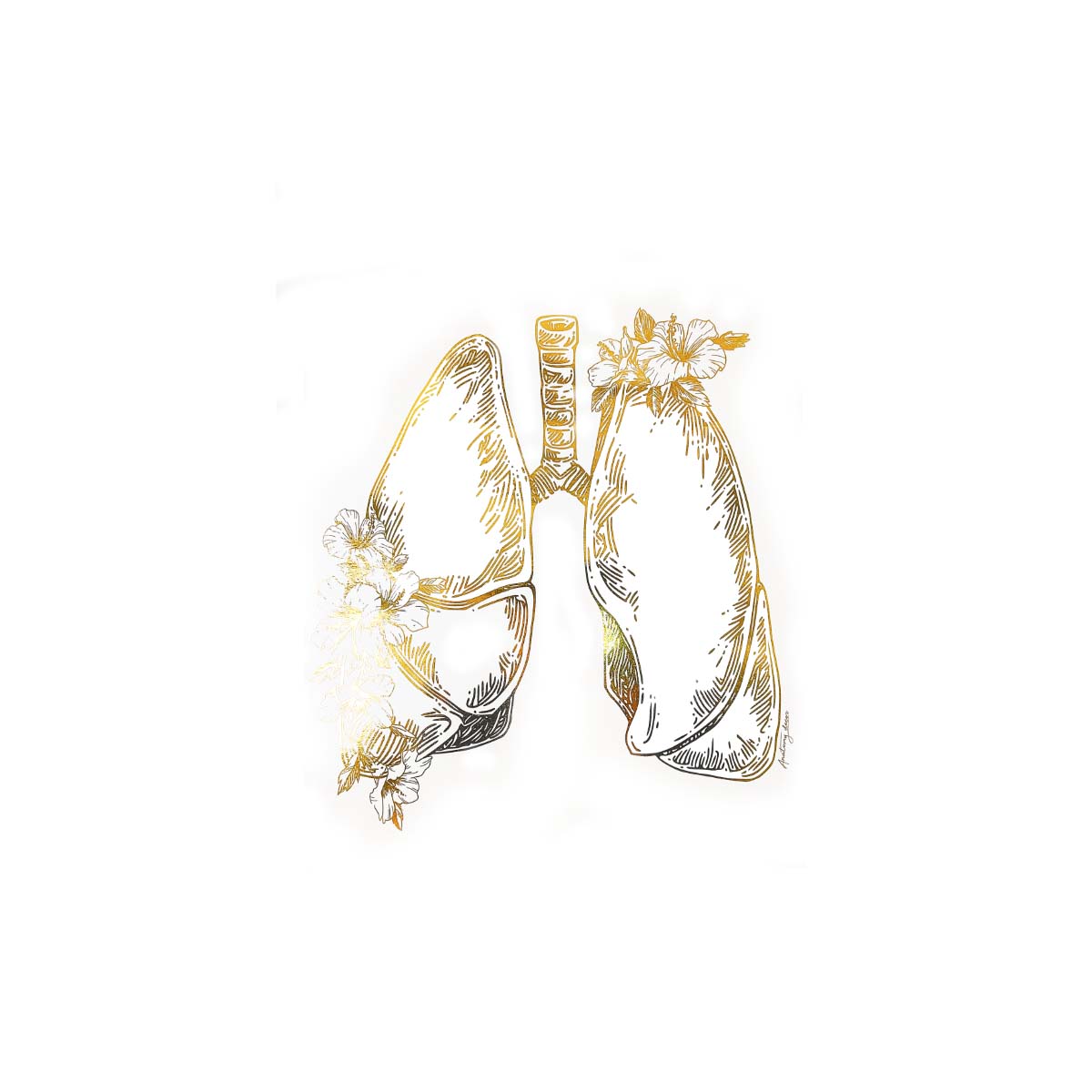 Grafika przedstawia płuca anatomiczne z kwiatami pokryte złotą błyszczącą folią.Dzięki zastosowaniu wysokiej klasy materiałów poligraficznych, złocenie doskonale odbija promienie słoneczne tworząc niepowtarzalny efekt. Nasze plakaty to połączeniem anatomii z elegancją, a złoty połysk nadaje pomieszczeniu naturalnego blasku.