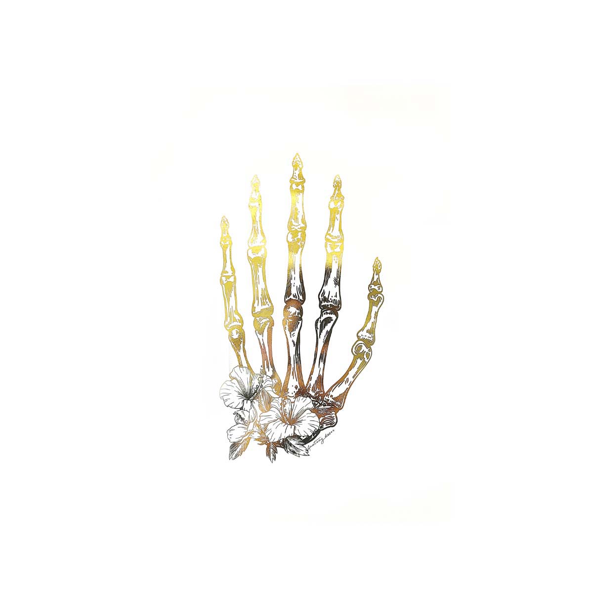 Grafika przedstawia rękę anatomiczną z kwiatami pokrytą złotą błyszczącą folią. Dzięki zastosowaniu wysokiej klasy materiałów poligraficznych, złocenie doskonale odbija promienie słoneczne tworząc niepowtarzalny efekt. Nasze plakaty to połączeniem anatomii z elegancją, a złoty połysk nadaje pomieszczeniu naturalnego blasku.