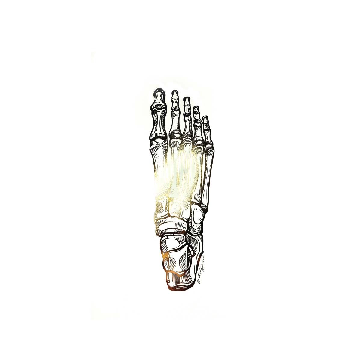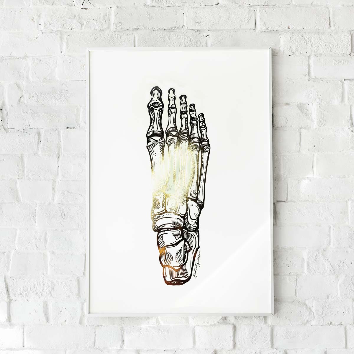 Grafika przedstawia stopę anatomiczną pokrytą złotą błyszczącą folią. Dzięki zastosowaniu wysokiej klasy materiałów poligraficznych, złocenie doskonale odbija promienie słoneczne tworząc niepowtarzalny efekt. Nasze plakaty to połączeniem anatomii z elegancją, a złoty połysk nadaje pomieszczeniu naturalnego blasku.