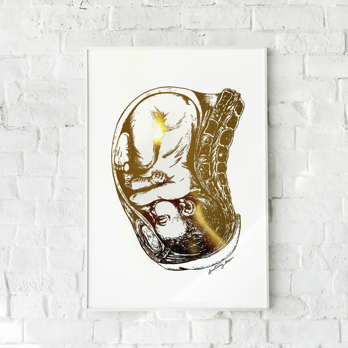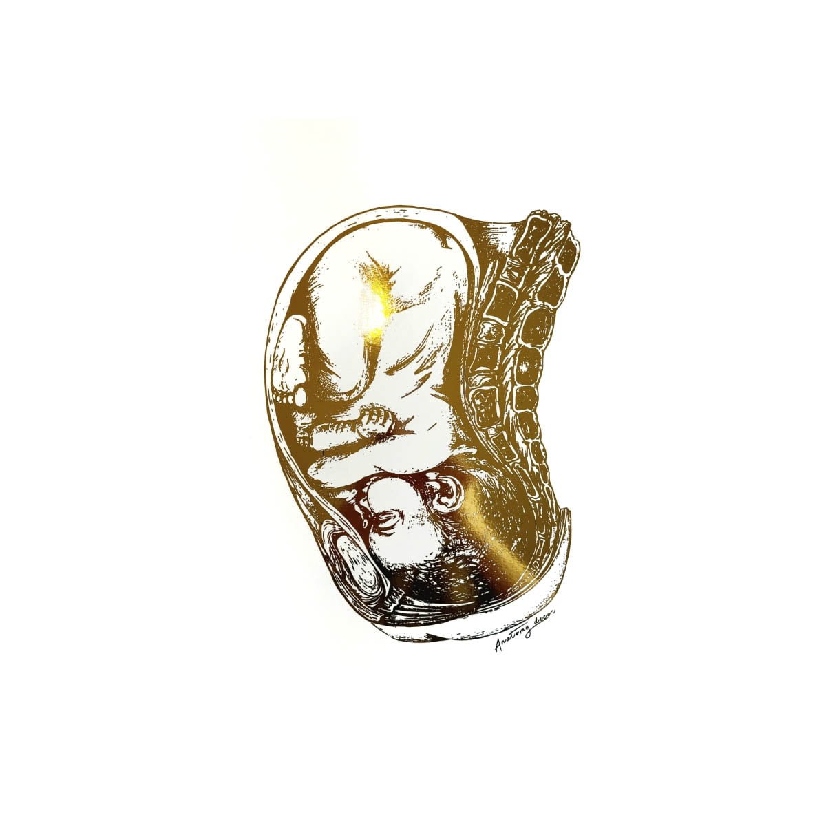 Grafika przedstawia rysunek Bobasa pokrytego złotą błyszczącą folią. Dzięki zastosowaniu wysokiej klasy materiałów poligraficznych, złocenie doskonale odbija promienie słoneczne tworząc niepowtarzalny efekt. Nasze plakaty to połączeniem anatomii z elegancją, a złoty połysk nadaje pomieszczeniu naturalnego blasku.