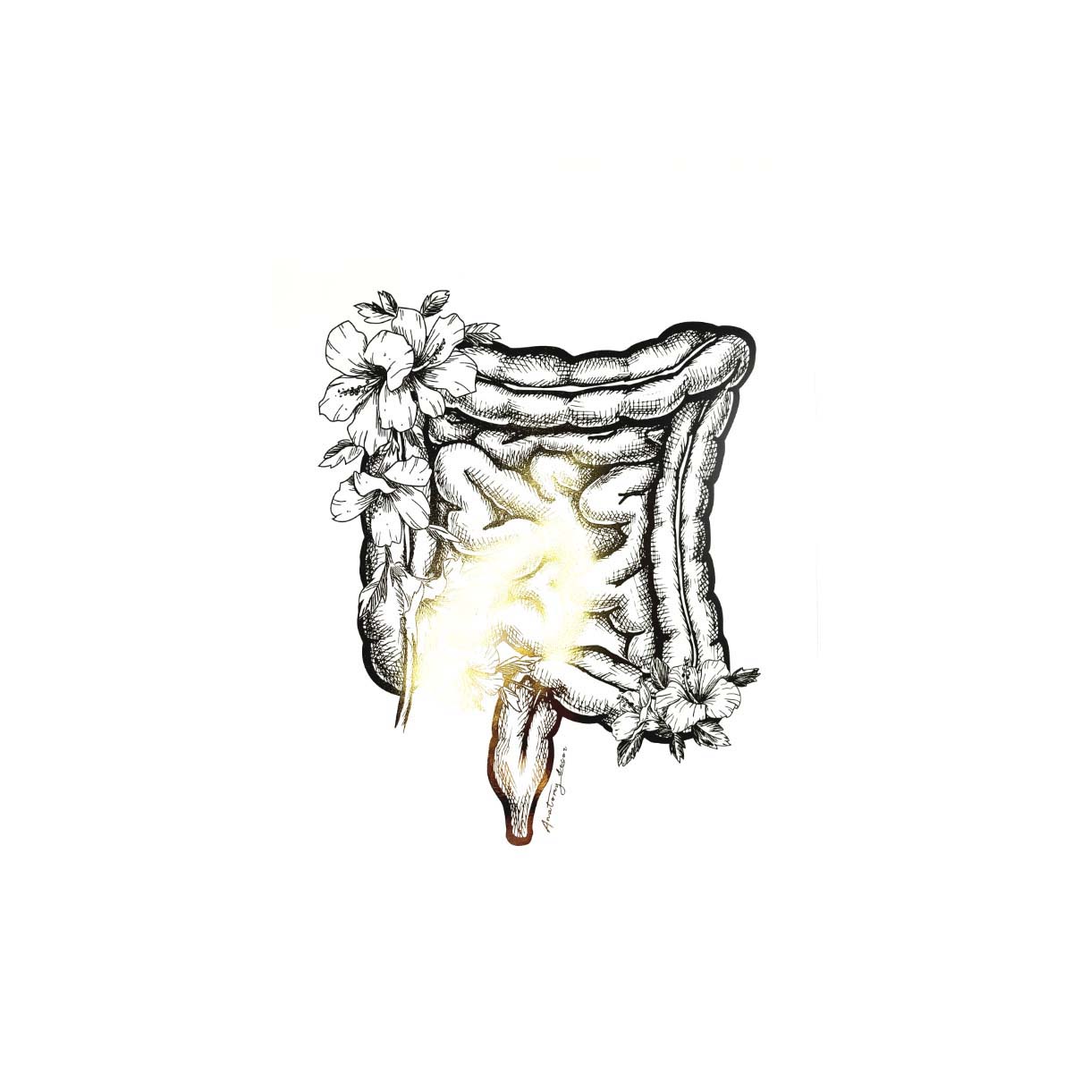 Grafika przedstawia jelita anatomiczne z kwiatami pokryty złotą błyszczącą folią. Dzięki zastosowaniu wysokiej klasy materiałów poligraficznych, złocenie doskonale odbija promienie słoneczne tworząc niepowtarzalny efekt. Nasze plakaty to połączeniem anatomii z elegancją, a złoty połysk nadaje pomieszczeniu naturalnego blasku.