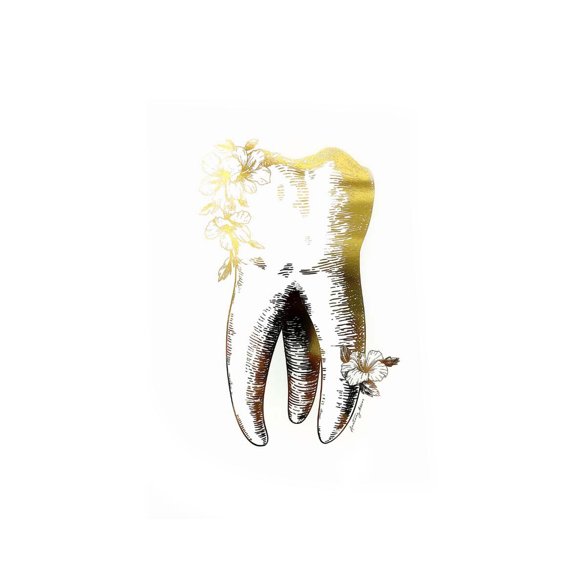 Grafika przedstawia ząb anatomiczny z kwiatami pokryty złotą błyszczącą folią. Dzięki zastosowaniu wysokiej klasy materiałów poligraficznych, złocenie doskonale odbija promienie słoneczne tworząc niepowtarzalny efekt. Nasze plakaty to połączeniem anatomii z elegancją, a złoty połysk nadaje pomieszczeniu naturalnego blasku.