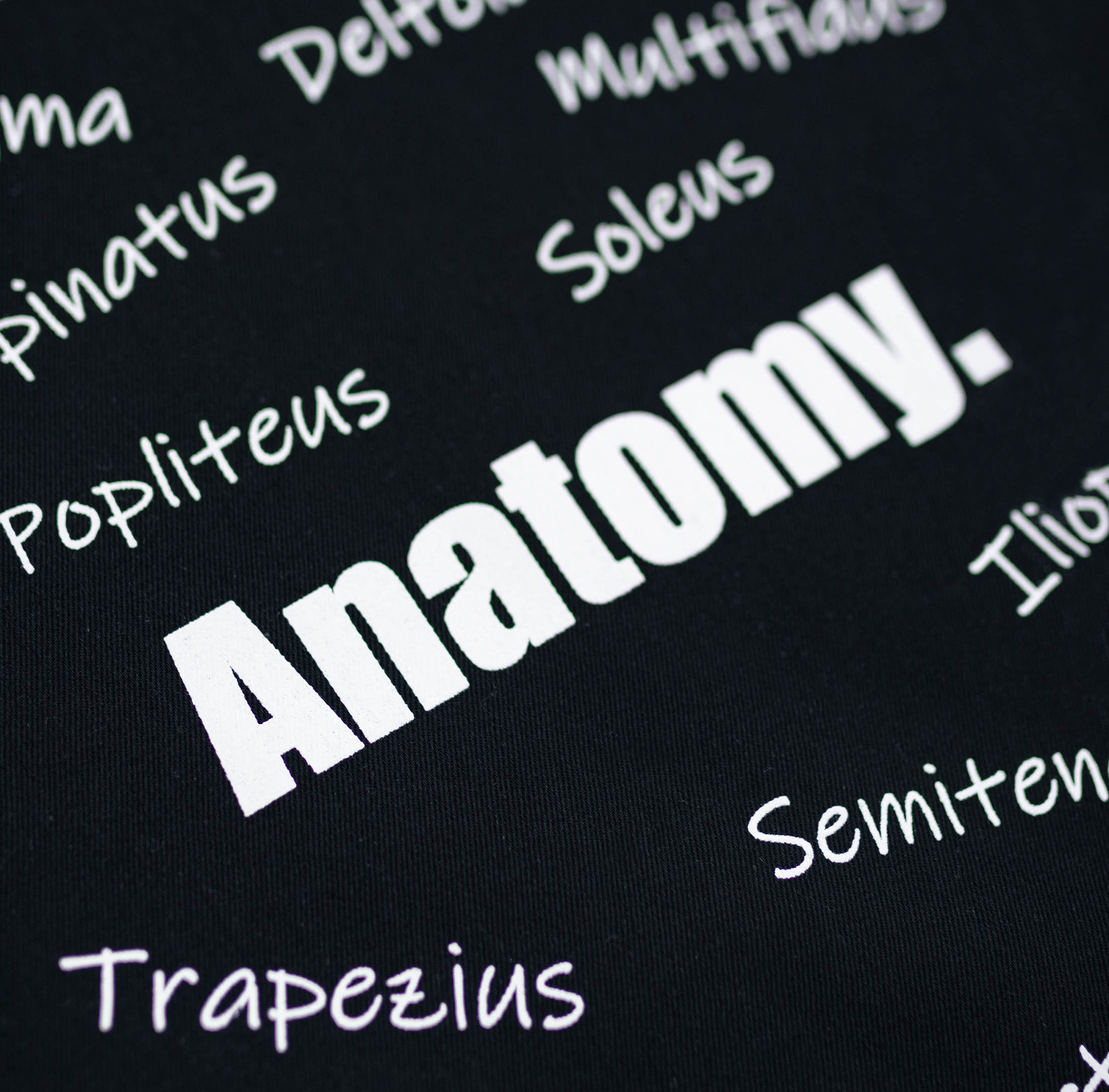 📄 Biały nadruk nazw mięśni (łacina) – subtelny, ale przyciągający wzrok motyw
