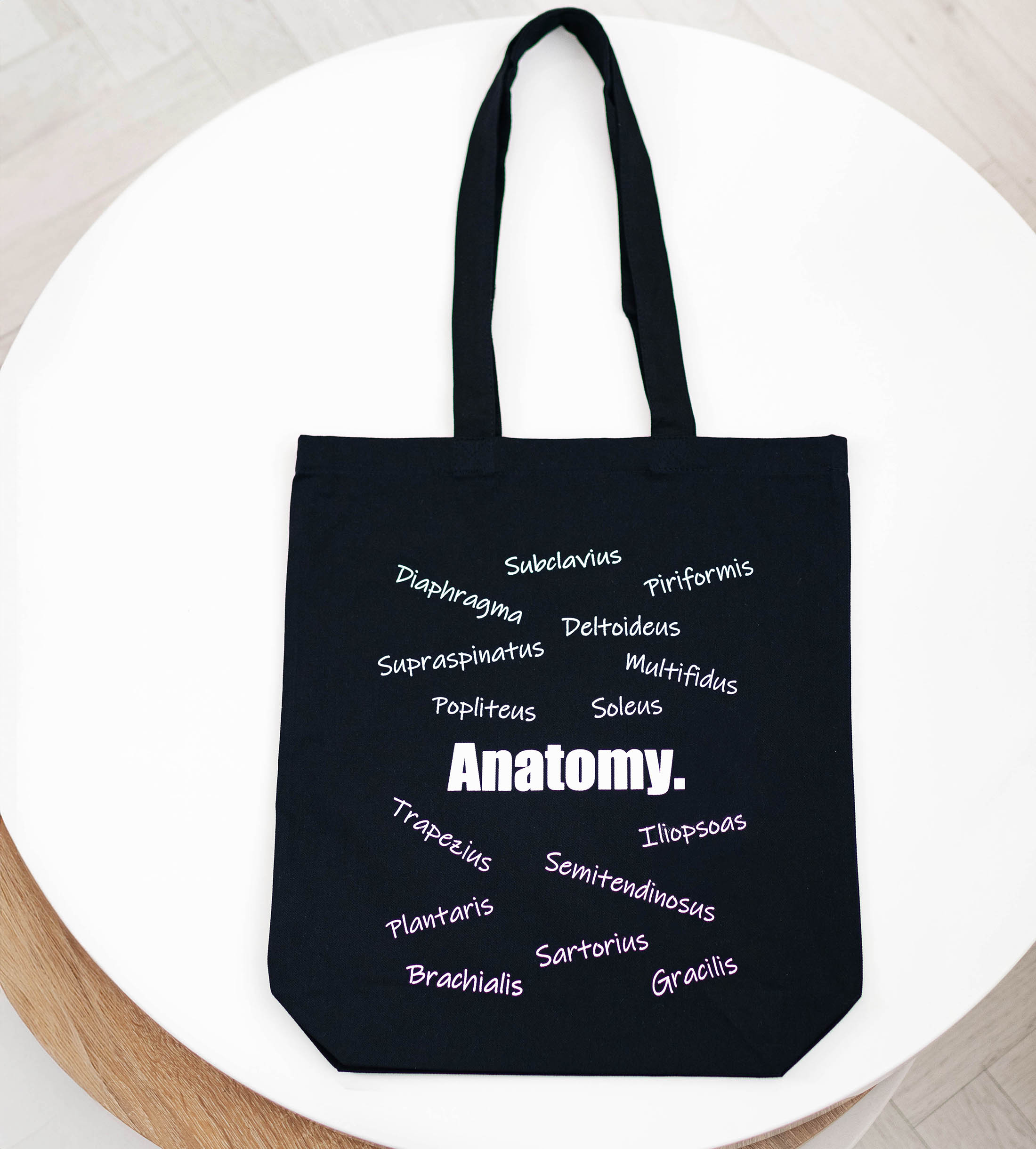 Czarna torba bawełniana z nadrukiem nazw mięśni. Prosty design z medycznym akcentem – idealna dla lekarzy, fizjoterapeutów, pielęgniarek i studentów.