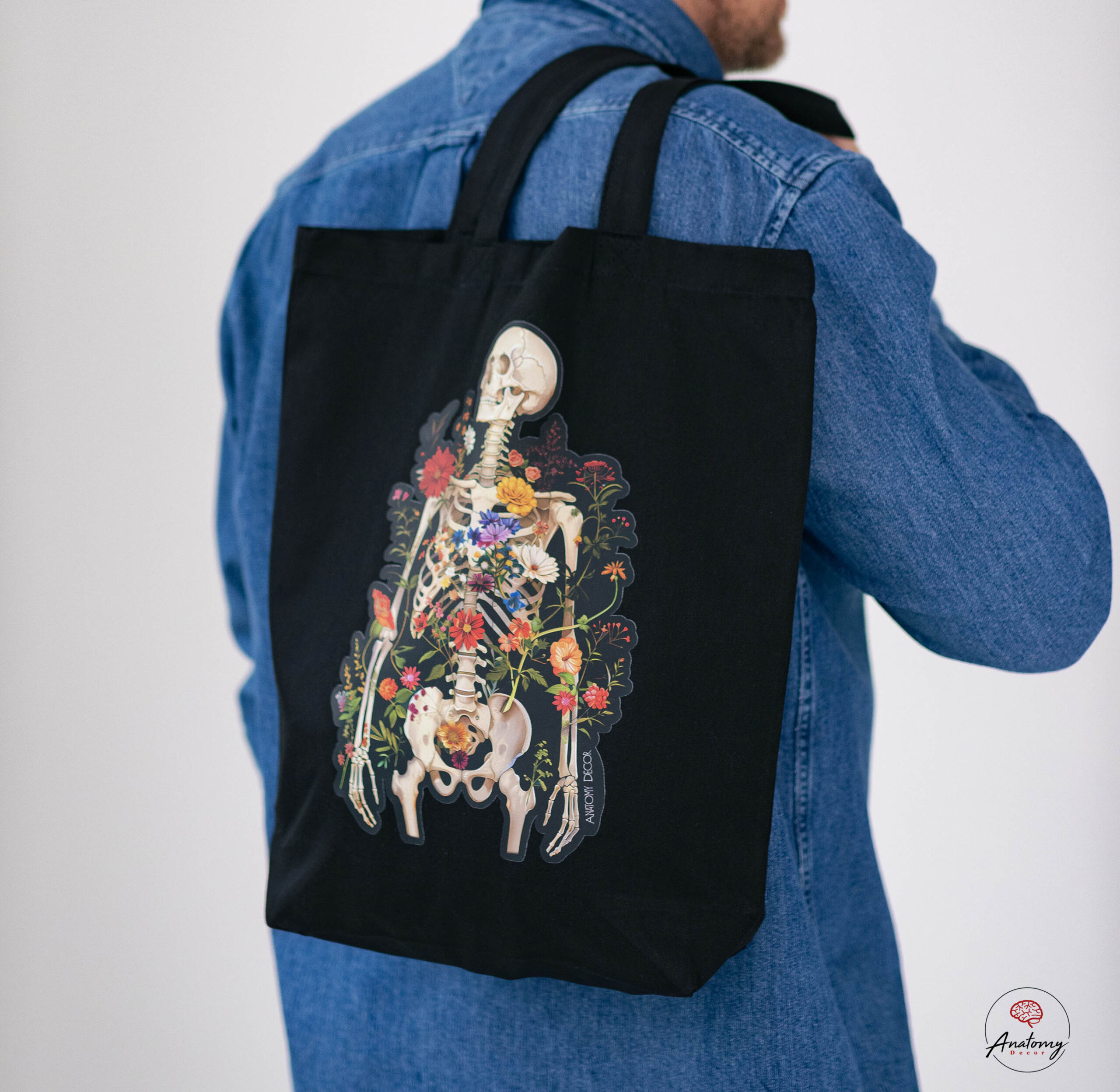 Czarna, bawełniana torba „Szkielet Człowieka z Kwiatami” – funkcjonalna, trwała i z medycznym akcentem.