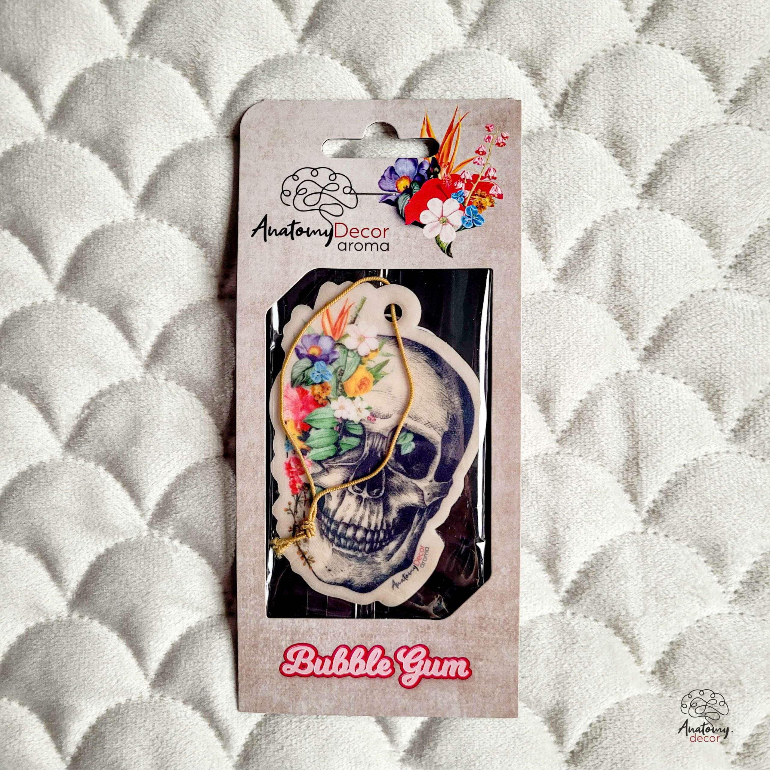 Zawieszka samochodowa przedstawiająca Czaszkę Anatomiczną z kwiatami o zapachu Bubble Gum. Przyjemny i długotrwały zapach.